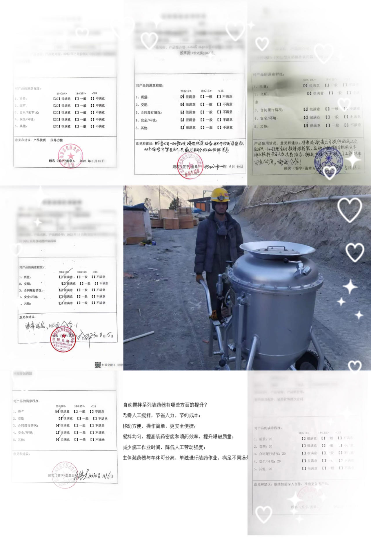 BQFA型自動攪拌系列裝藥器,與人工攪拌相比,無需人工攪拌,節(jié)省人力且攪拌均勻,移動方便,操作簡單便捷,大大降低人工勞動強(qiáng)度,提高裝藥密度、爆破質(zhì)量,減少施工作業(yè)時間。先后出口塔吉克斯坦、老撾,秘魯,尼日利亞、法國等國家,使用情況反饋中得到一致好評并大力推薦。